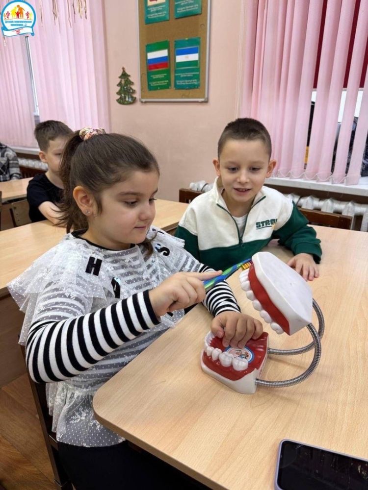 Для этого врач взяла из поликлиники демонстрационные материалы, муляж челюсти с зубами, средства гигиены для рта и памятки.