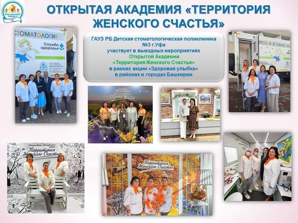 Совместная работа реализуется на выездных мероприятиях Открытой Академии в рамках акции «Здоровая улыбка» в районах и городах Башкирии. Проводятся консультирования родителей и оказывается стоматологическая помощь детям Башкирии.