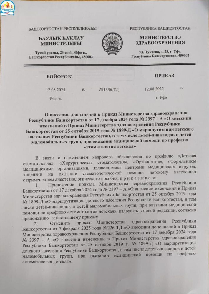 На основании многочисленных обращений граждан и ответственных стоматологов в районах и городах РБ, проработаны и внесены изменения в приказ Минздрава РБ от 25 октября 2019 года № 1899-Д «О маршрутизации детского населения Башкирии по детской стоматологии и ортодонтии».