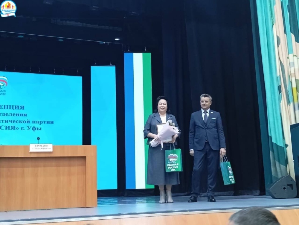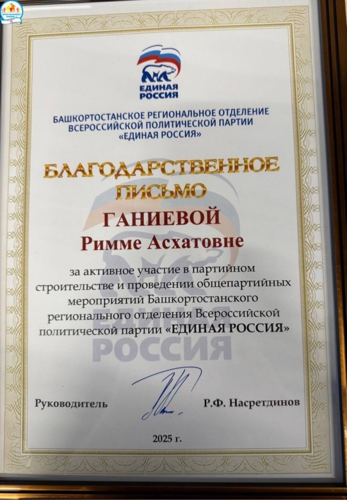 За активное участие в партийном строительстве и проведении общепартийных мероприятий Башкортостанского отделения Всероссийской политической партии «Единая Россия» Римма Ганиева награждена Благодарственным письмом.