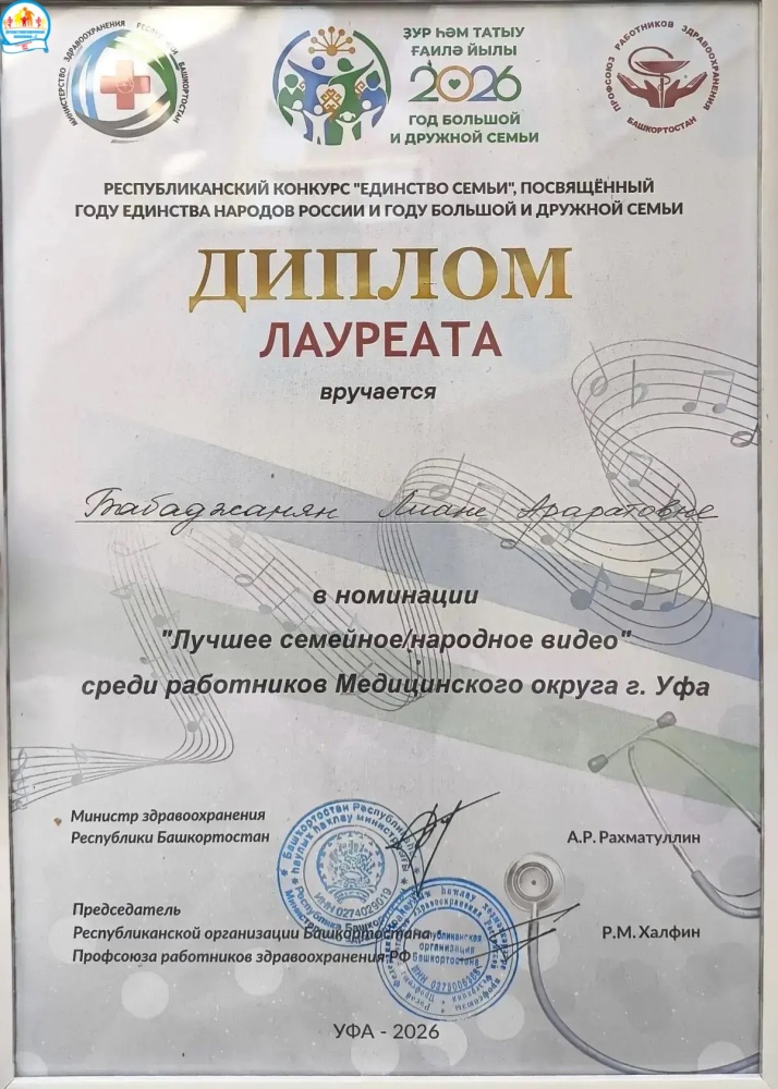 28 марта 2026 года врач-стоматолог детский ГАУЗ РБ Детская стоматологическая поликлиника №3 г. Уфа Лиана Бабаджанян приняла участие во II этапе Республиканского конкурса "Единство семьи", посвященного Году единства народов России и Году большой и дружной семьи, среди учреждений здравоохранения, подведомственных Министерству здравоохранения Республики Башкортостан.