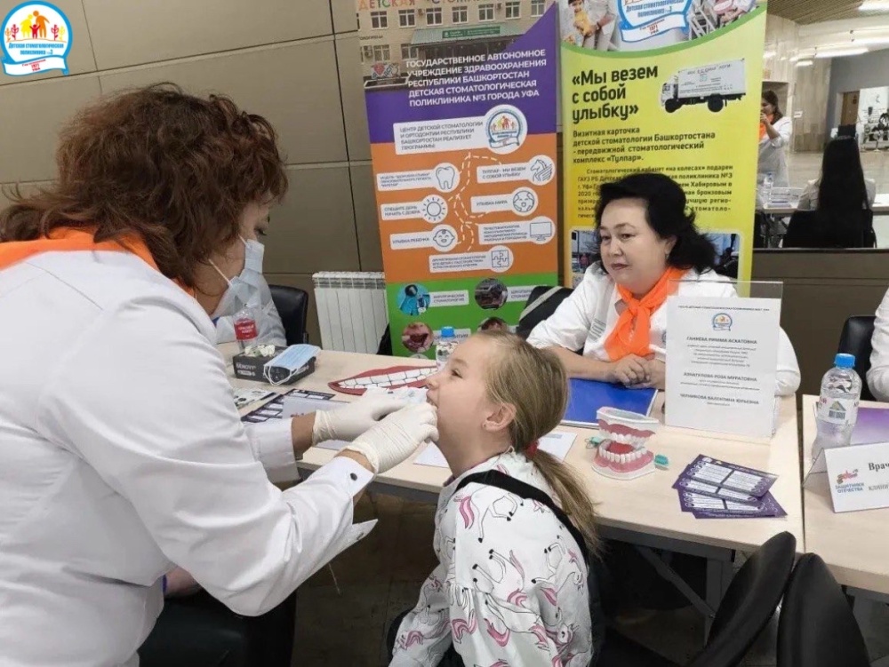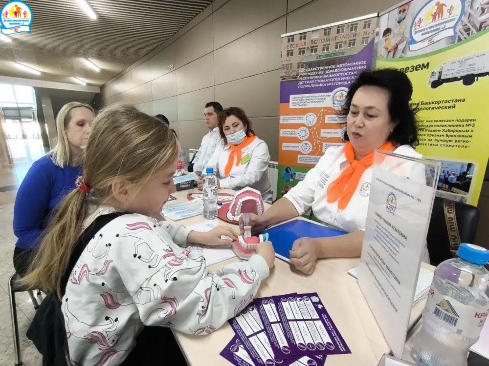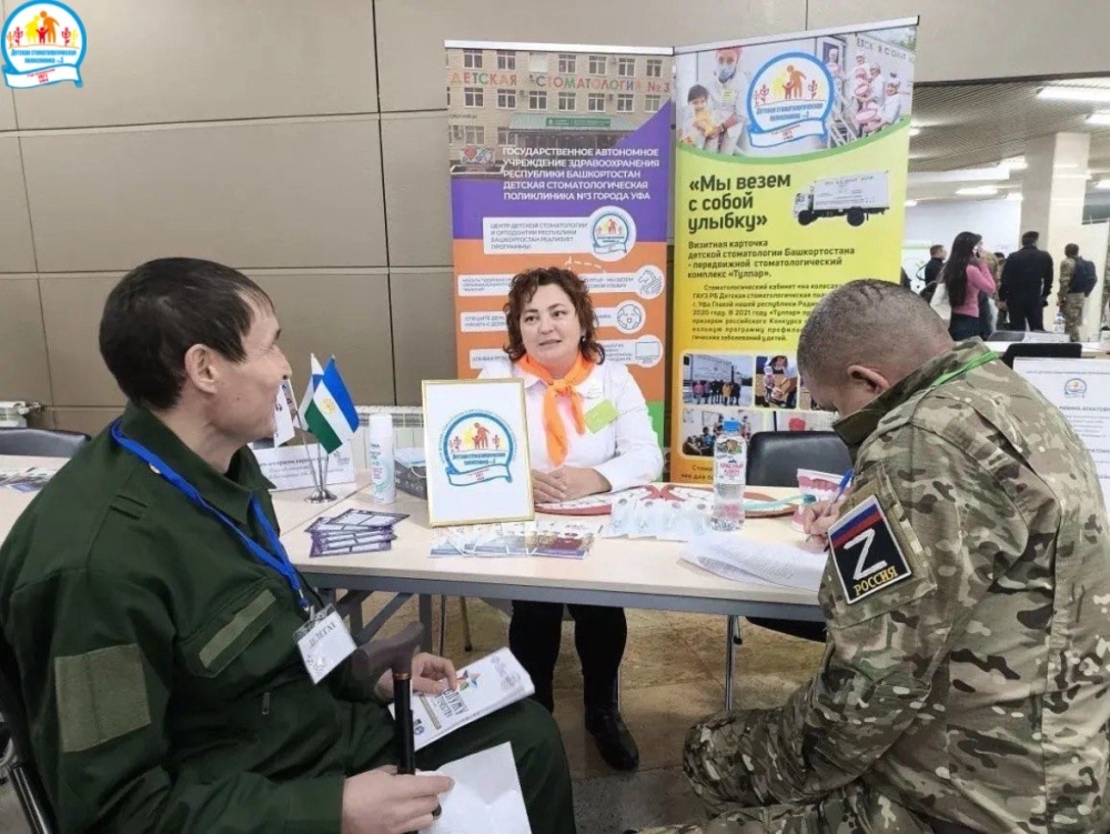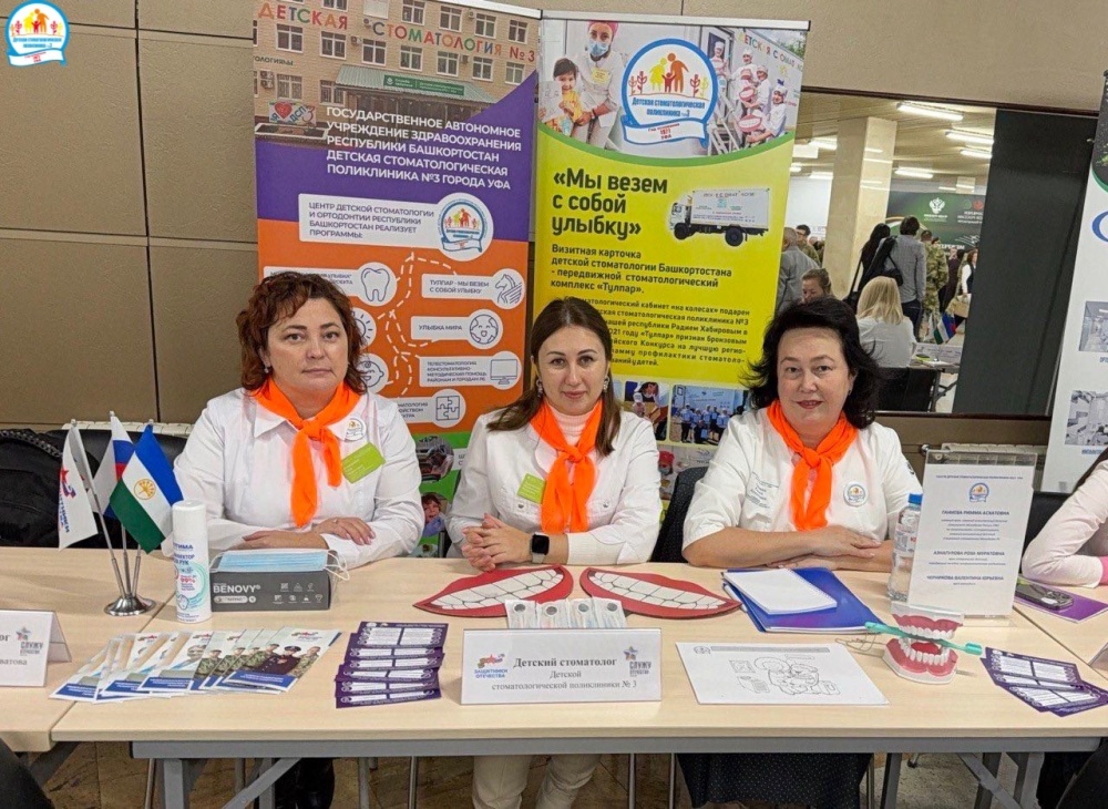 Команда Детской стоматологической поликлиники №3 г. Уфа в составе главного врача Риммы Ганиевой, заведующей отделением Розы Азнагуловой и методиста Валентины Черниковой провела стоматологические консультации для детей участников и ветеранов СВО в рамках Межрегионального патриотического фестиваля среди ветеранов СВО и членов их семей в Конгресс-Холле Торатау.