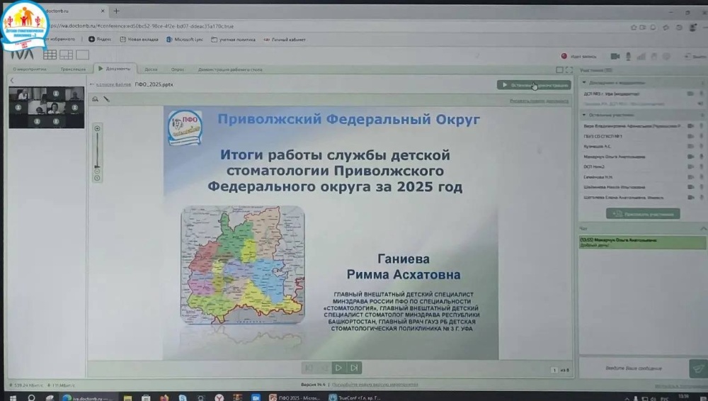 25 марта 2026 года главным внештатным детским специалистом Минздрава России по Приволжскому федеральному округу по профилю "стоматология", главным врачом Детской стоматологической поликлиники №3 г. Уфа Риммой Ганиевой и врачом-методистом Валентиной Черниковой проведено видеоселекторное совещание по итогам приема годовых отчётов за 2025 год по службе детской стоматологии в округе.
