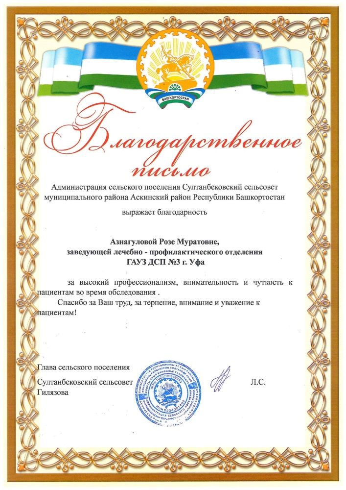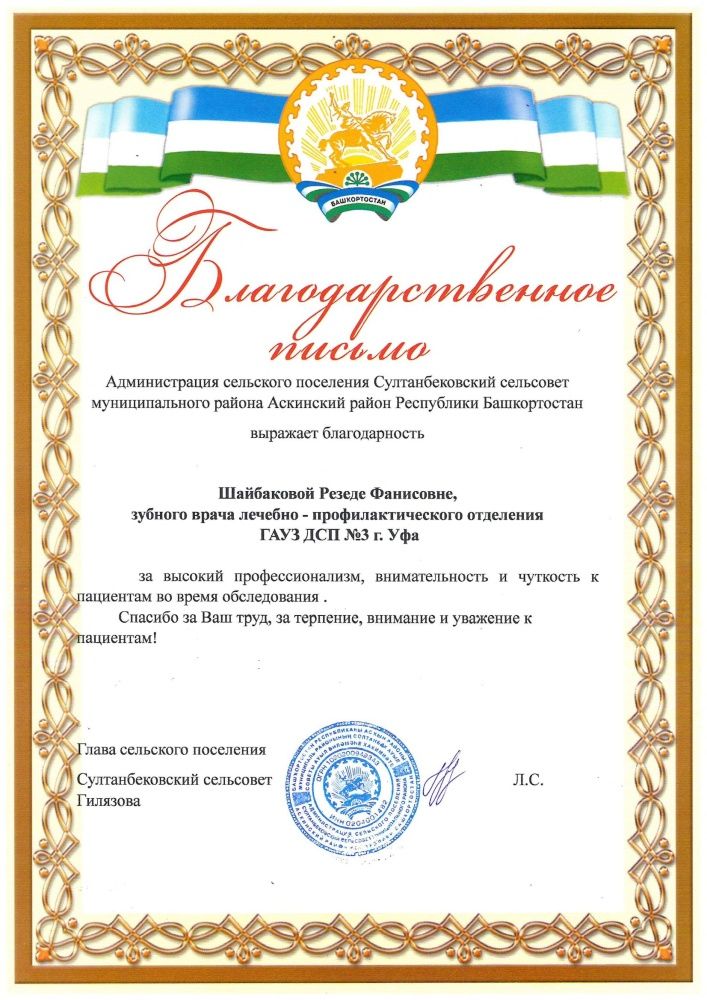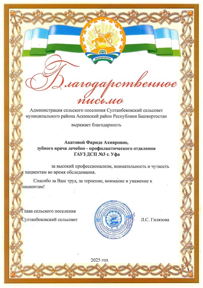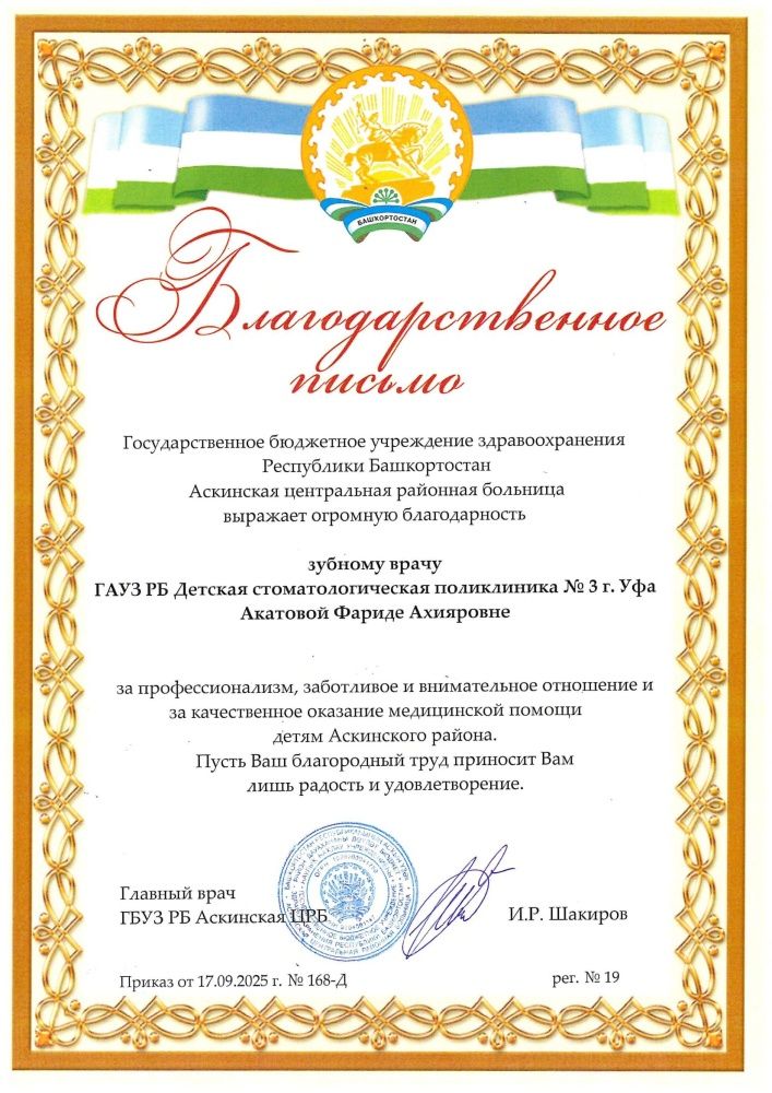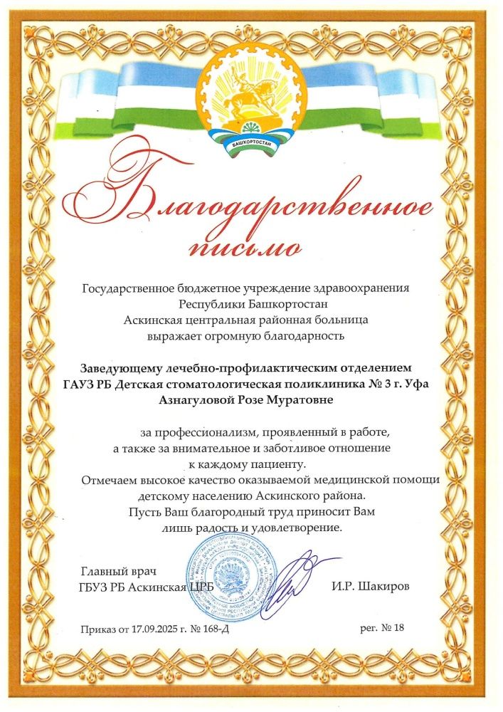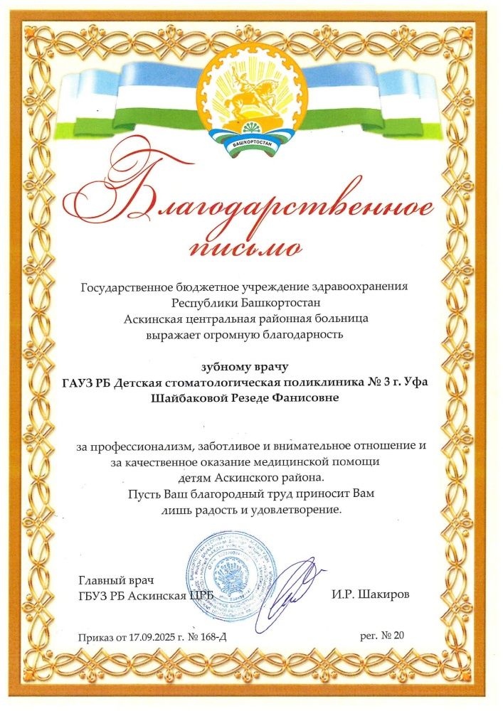 Благодарности врачам по результатам выезда в Аскинский район Башкирии на передвижном стоматологическом комплексе «Тулпар»